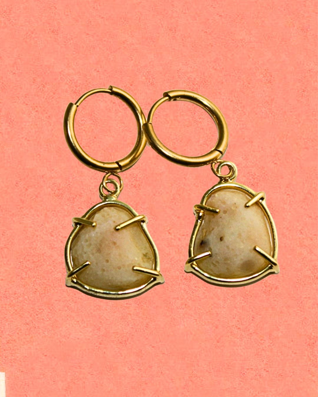 These earrings combine durability and elegance: crafted in stainless steel with a sterling silver 925 base, finished with 2.5 micron electroplated gold for long-lasting shine. Each piece is set with a unique white stone, making it truly one of a kind. The pure white color symbolizes clarity, new beginnings, and protection — a timeless reminder of inner strength and fresh energy every time you wear them.