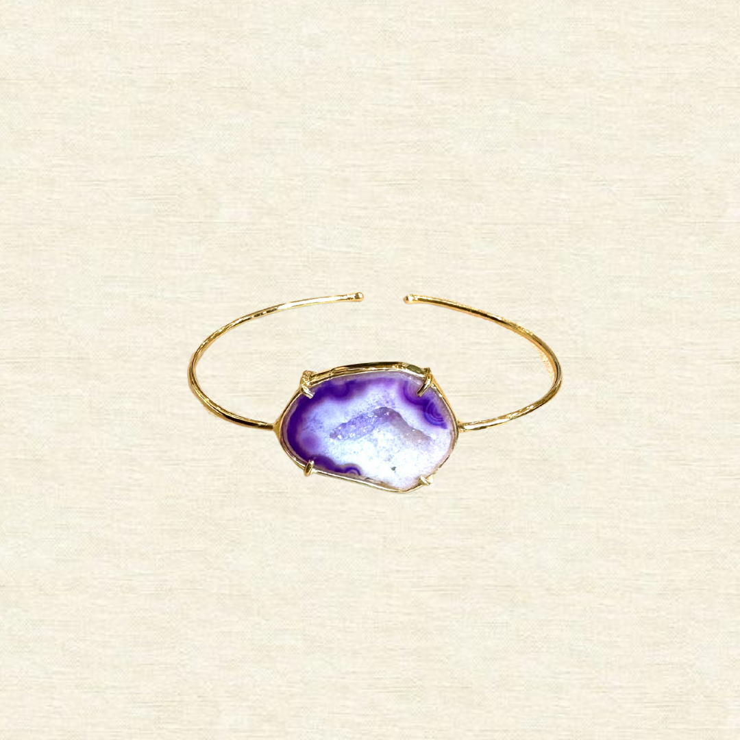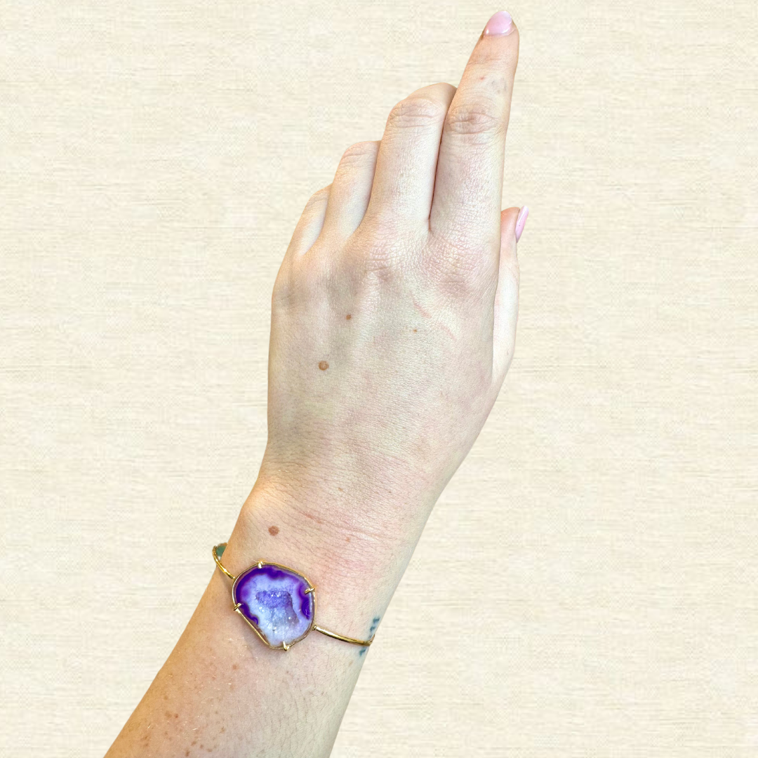 A geode bracelet with a 925 silver base and four layers of 18k goldplating is a luxurious and elegant accessory. The combination of the sturdy silver core and the rich gold layers enhances durability while exuding sophistication. Paired with natural geode slices or crystals, this bracelet becomes a unique blend of earthy charm and refined craftsmanship. The shimmering crystals and gold accents make it a perfect statement piece, ideal for elevating any outfit with a touch of timeless elegance.