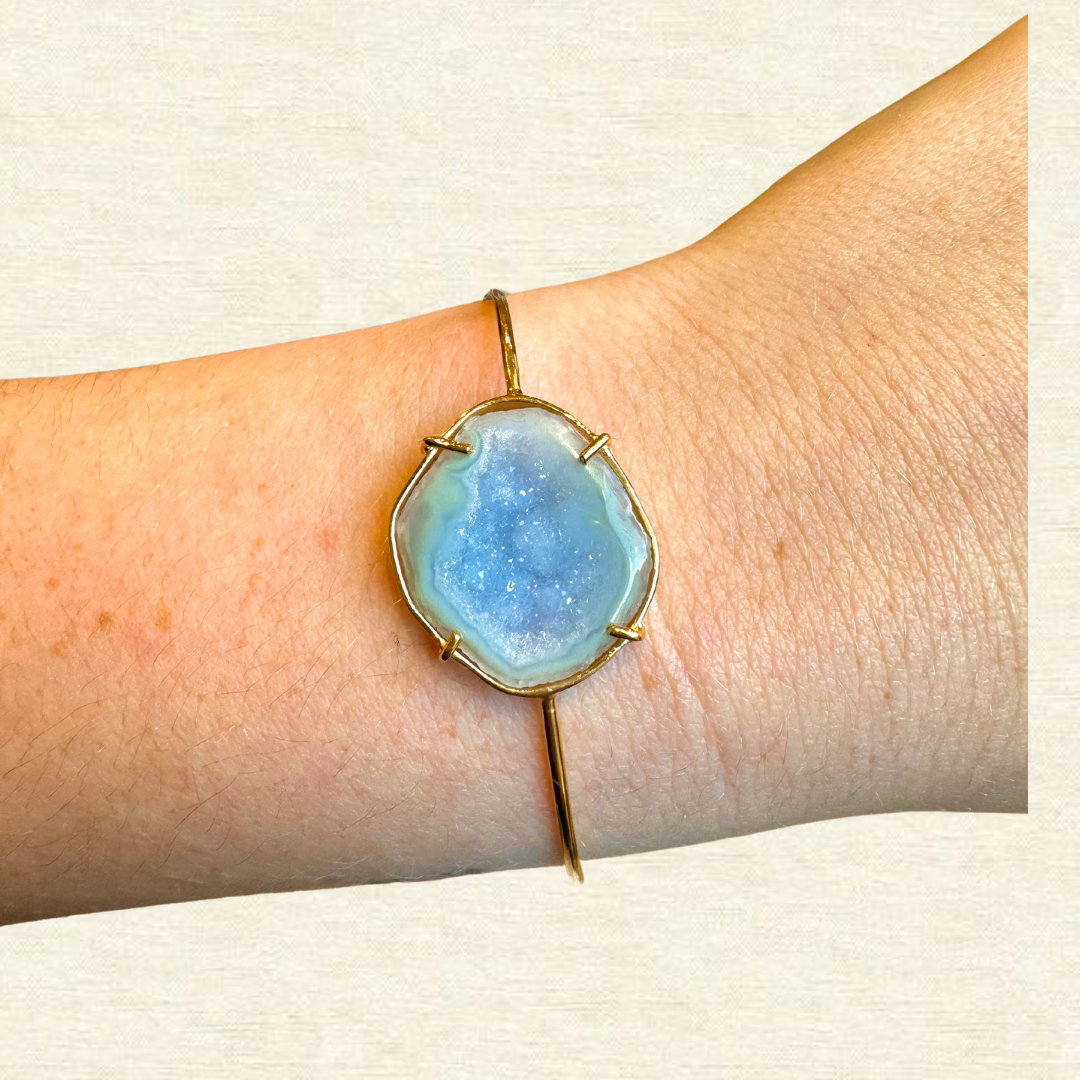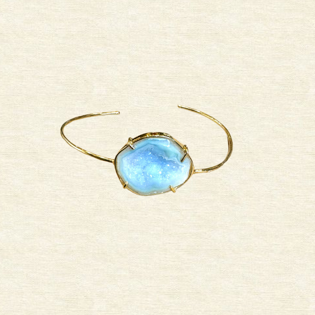 A geode bracelet with a 925 silver base and four layers of 18k goldplating is a luxurious and elegant accessory. The combination of the sturdy silver core and the rich gold layers enhances durability while exuding sophistication. Paired with natural geode slices or crystals, this bracelet becomes a unique blend of earthy charm and refined craftsmanship. The shimmering crystals and gold accents make it a perfect statement piece, ideal for elevating any outfit with a touch of timeless elegance.
