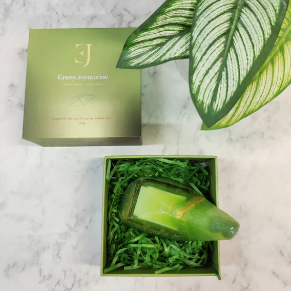Geïnspireerd door Aventurijn met een geur van olijven en tijm. Aventurijn heeft een kalmerende en beschermende werking en geeft rust en een goed gevoel. Het helpt geluk en voorspoed aan te trekken, helpt te ontspannen en maakt je geduldiger, toleranter, positiever, empathischer en creatiever.