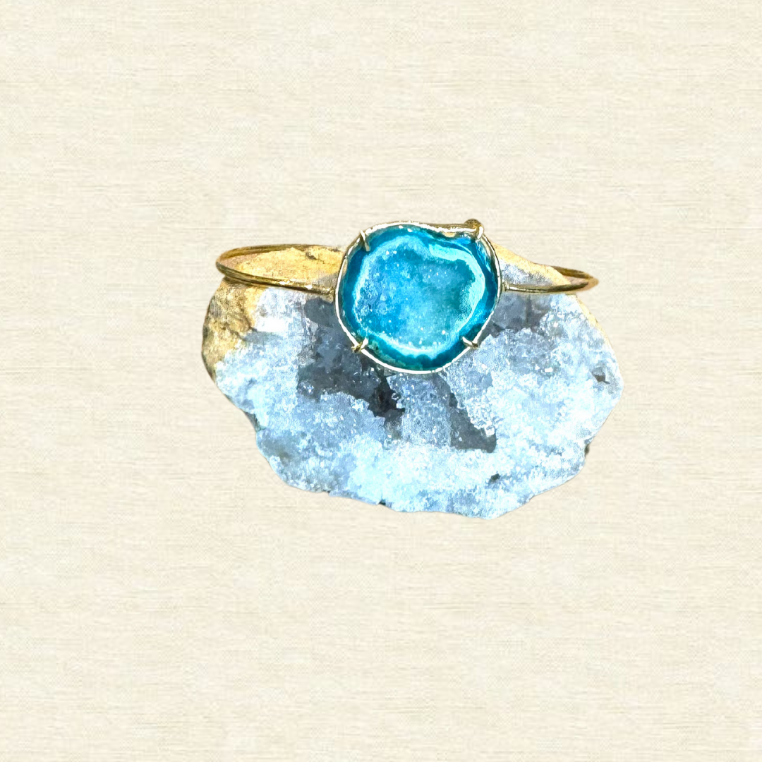 A geode bracelet with a 925 silver base and four layers of 18k goldplating is a luxurious and elegant accessory. The combination of the sturdy silver core and the rich gold layers enhances durability while exuding sophistication. Paired with natural geode slices or crystals, this bracelet becomes a unique blend of earthy charm and refined craftsmanship. The shimmering crystals and gold accents make it a perfect statement piece, ideal for elevating any outfit with a touch of timeless elegance.