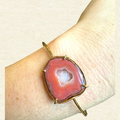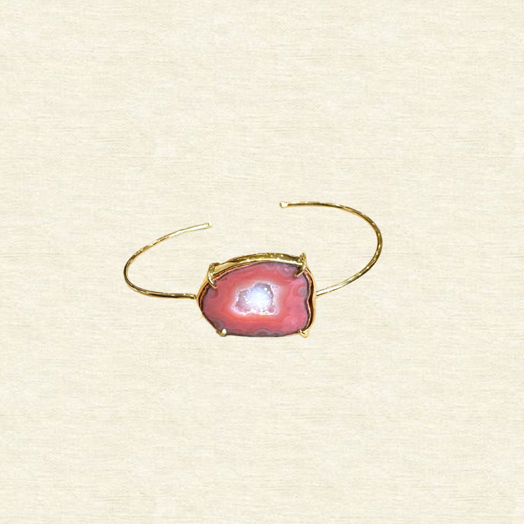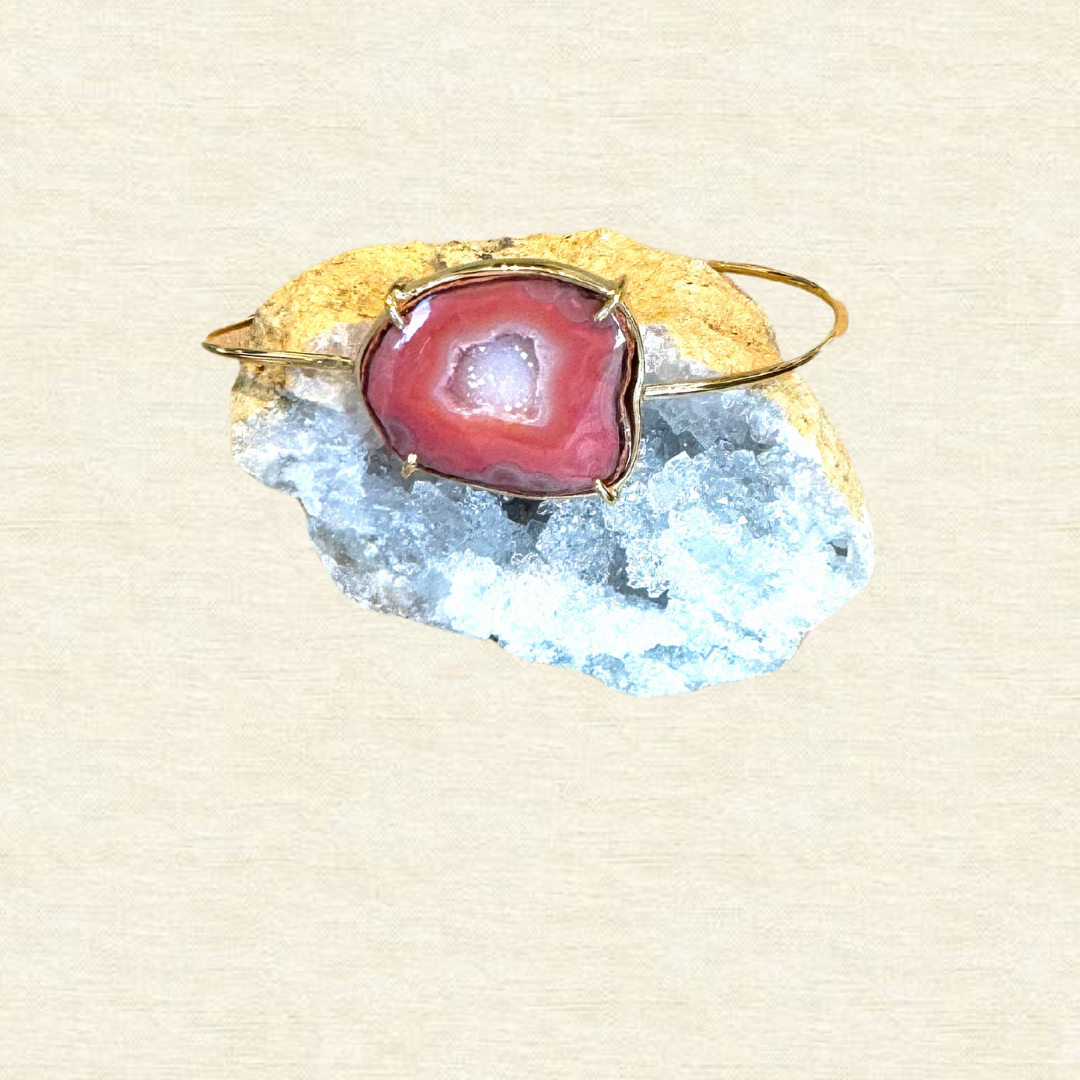 A geode bracelet with a 925 silver base and four layers of 18k goldplating is a luxurious and elegant accessory. The combination of the sturdy silver core and the rich gold layers enhances durability while exuding sophistication. Paired with natural geode slices or crystals, this bracelet becomes a unique blend of earthy charm and refined craftsmanship. The shimmering crystals and gold accents make it a perfect statement piece, ideal for elevating any outfit with a touch of timeless elegance.