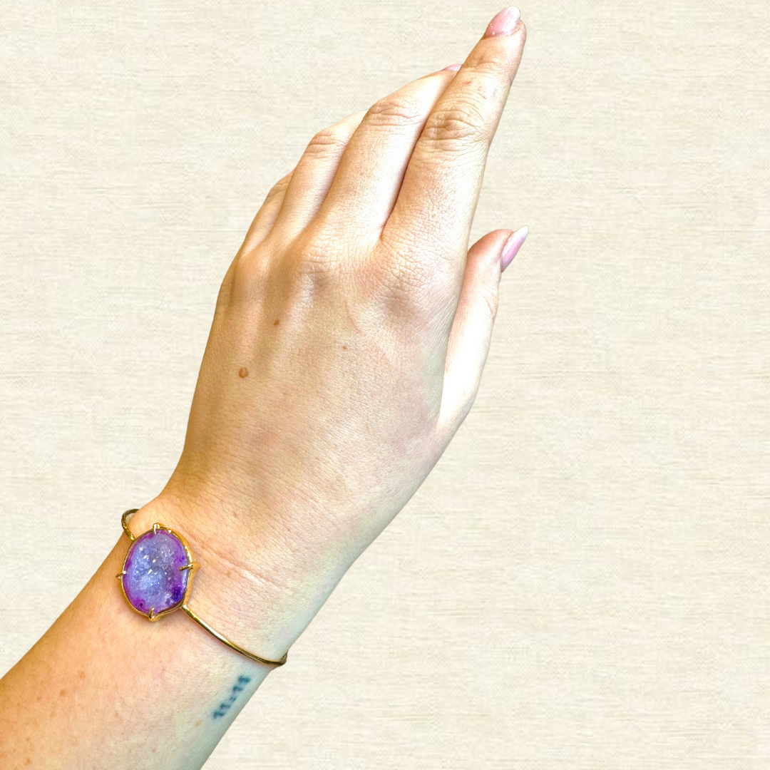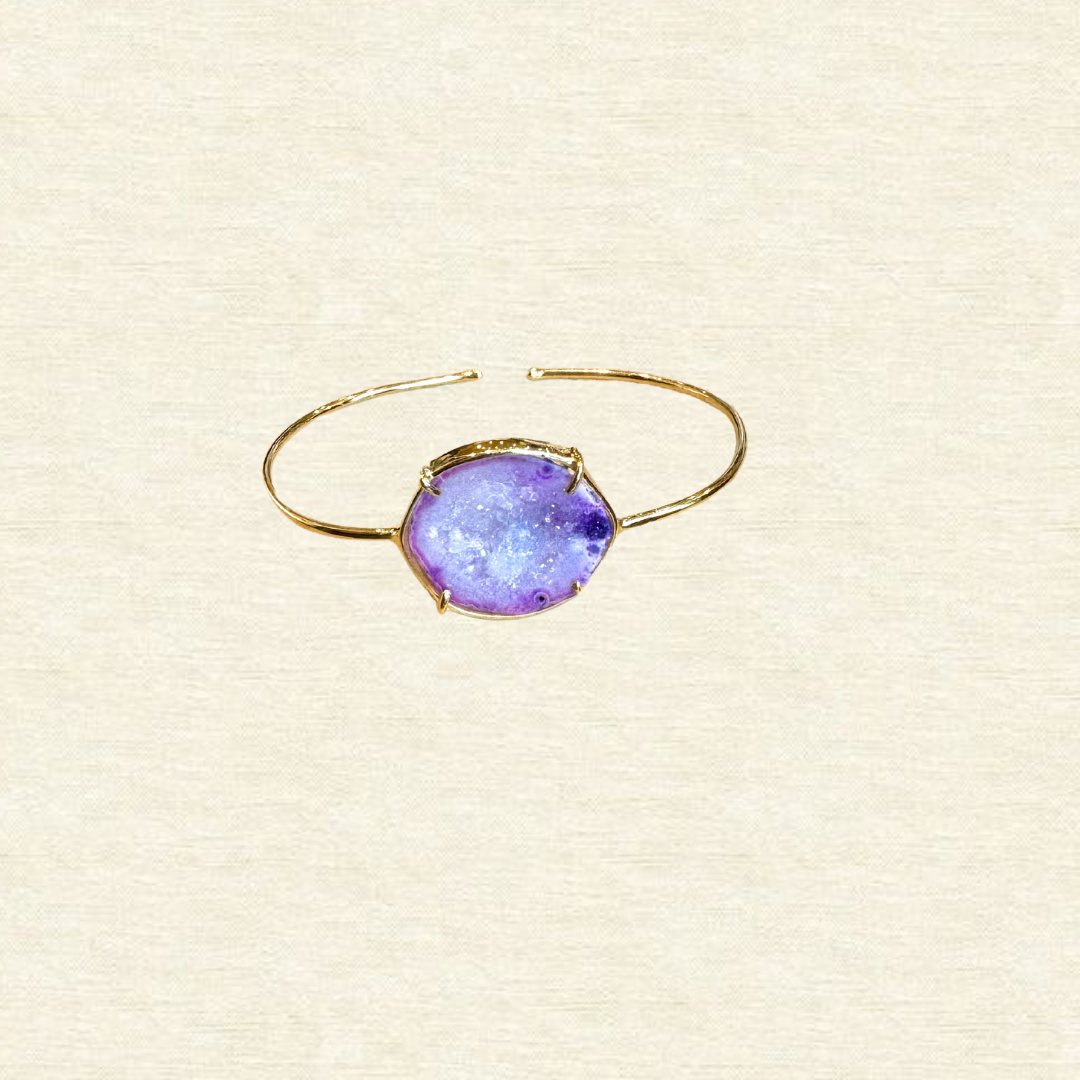 A geode bracelet with a 925 silver base and four layers of 18k goldplating is a luxurious and elegant accessory. The combination of the sturdy silver core and the rich gold layers enhances durability while exuding sophistication. Paired with natural geode slices or crystals, this bracelet becomes a unique blend of earthy charm and refined craftsmanship. The shimmering crystals and gold accents make it a perfect statement piece, ideal for elevating any outfit with a touch of timeless elegance.