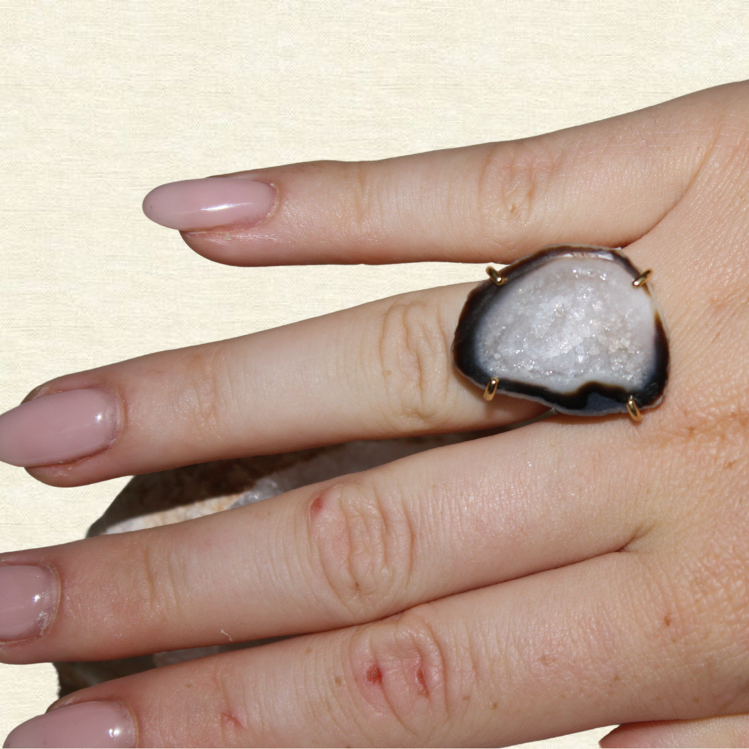 A geode agate crystal is a unique and beautiful natural formation. It consists of a hollow, rounded rock lined with layers of agate, a type of quartz, which often displays stunning banding patterns. Inside, the geode may contain sparkling crystals, creating a mesmerizing display. These formations enhance inner stability, composure, and protect your peace.