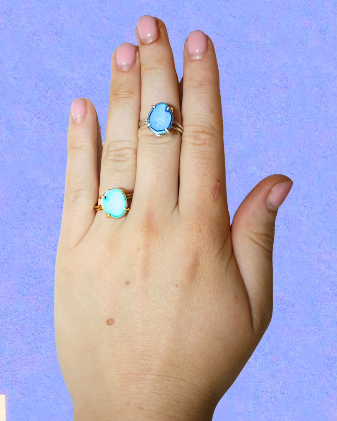 Crafted in 925 sterling silver with a luxurious 2-micron gold plating, each ring features a truly unique geode stone – no two are ever the same. Subtle in size yet powerful in presence, these adjustable rings are wearable pieces of nature, designed for those who value individuality, energy, and timeless elegance.