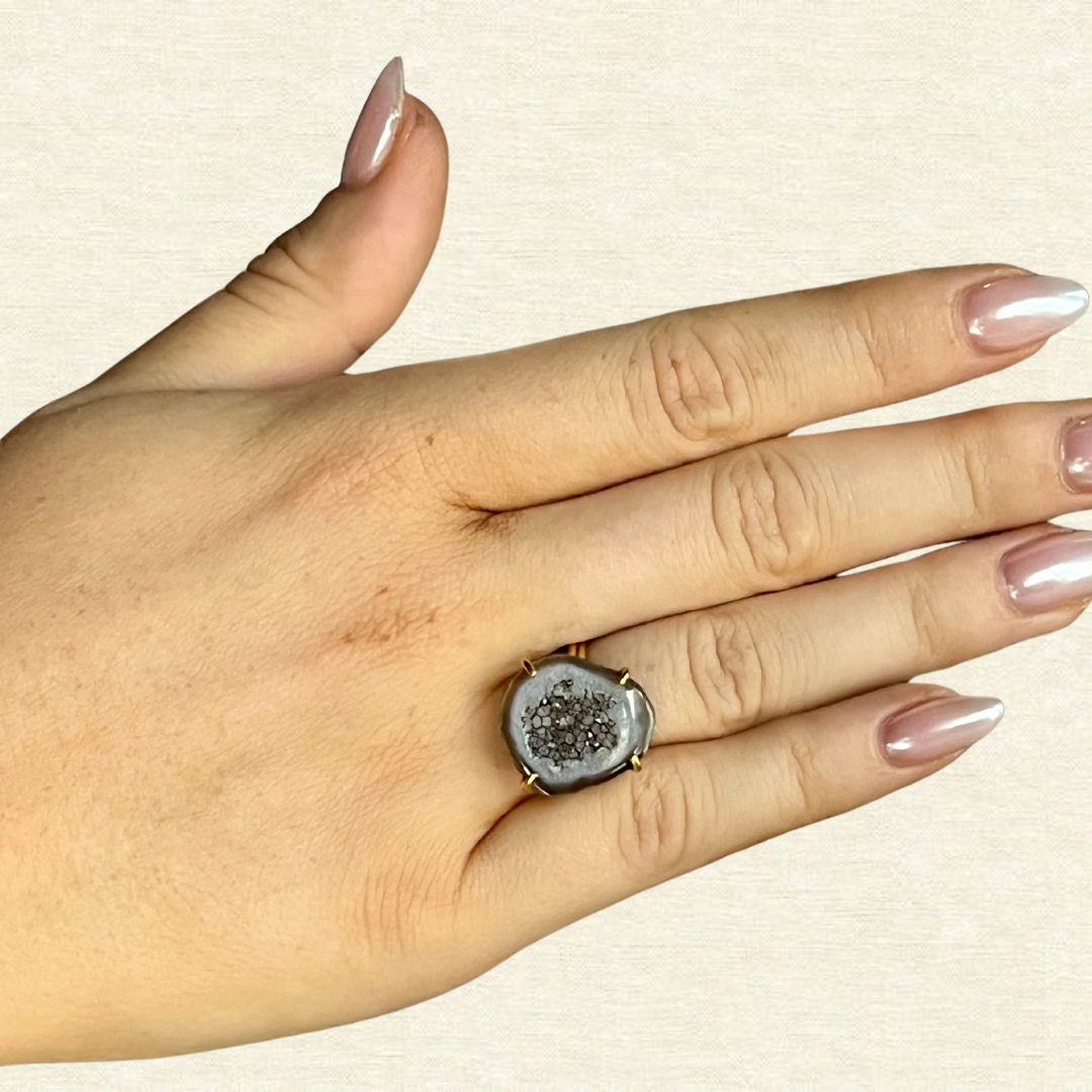 A geode agate crystal is a unique and beautiful natural formation. It consists of a hollow, rounded rock lined with layers of agate, a type of quartz, which often displays stunning banding patterns. Inside, the geode may contain sparkling crystals, creating a mesmerizing display. These formations enhance inner stability, composure, and protect your peace.
