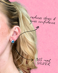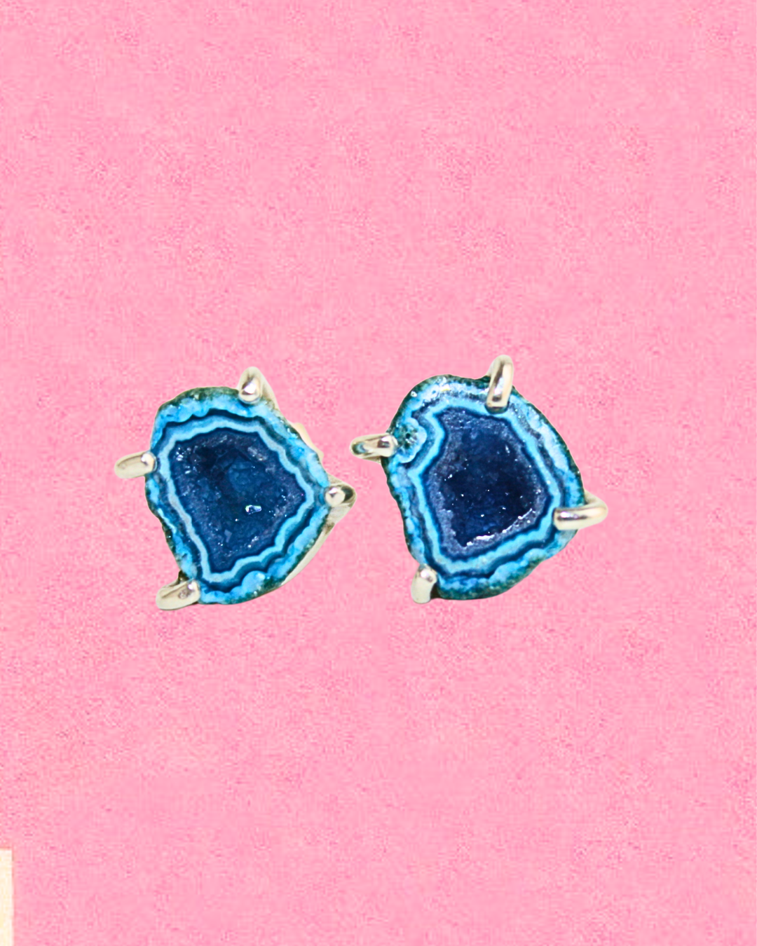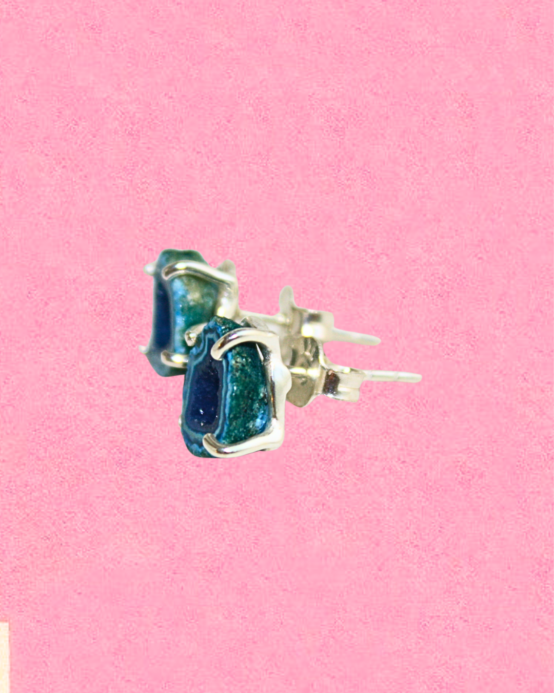 A pair of stud earrings featuring raw blue geodes, each with a natural sparkling effect that catches the light beautifully. Set in 925 sterling silver, they not only add elegance but also carry the meaning of geodes: symbols of inner strength, balance, and hidden beauty. The calming blue tones are believed to promote peace and clarity.
