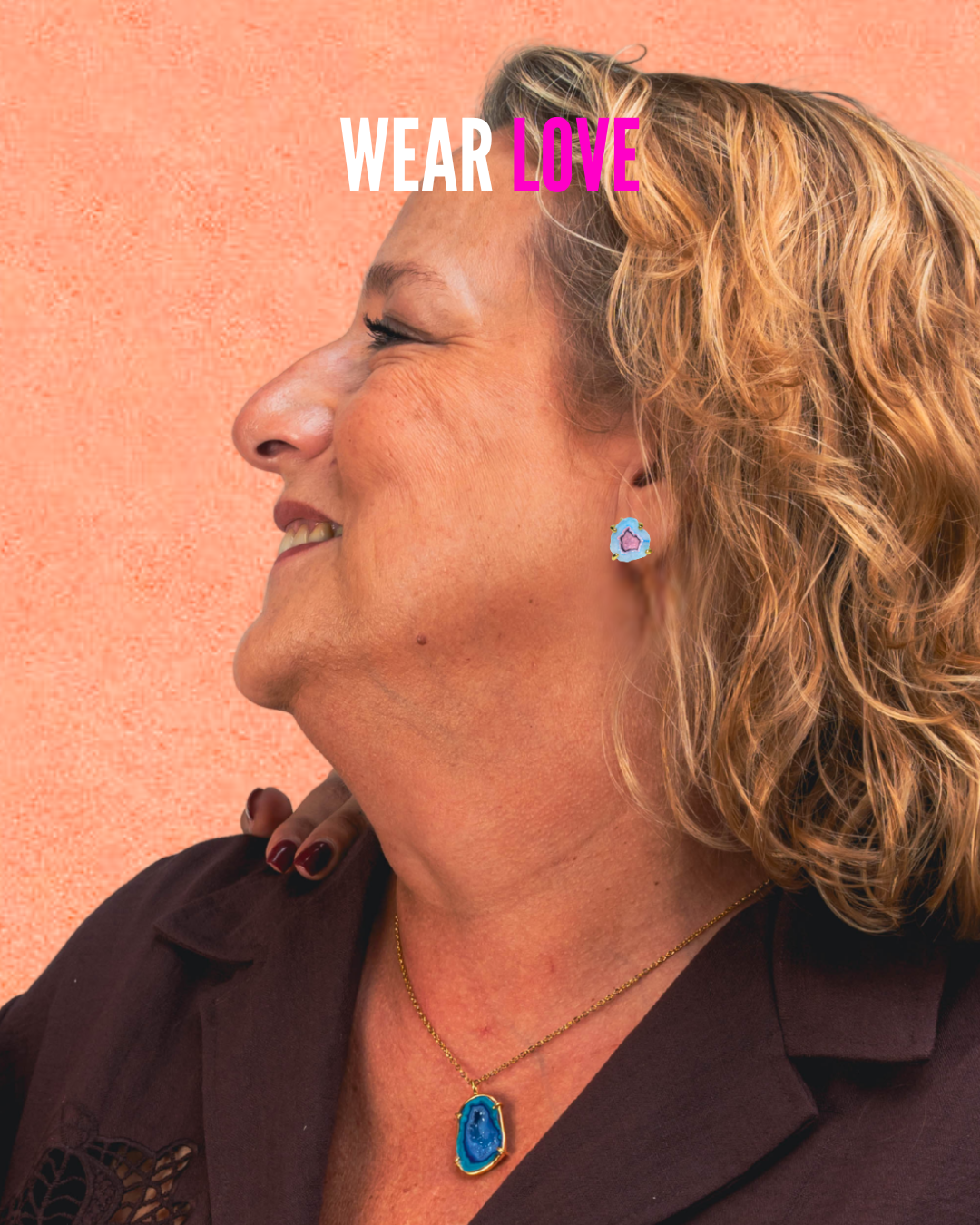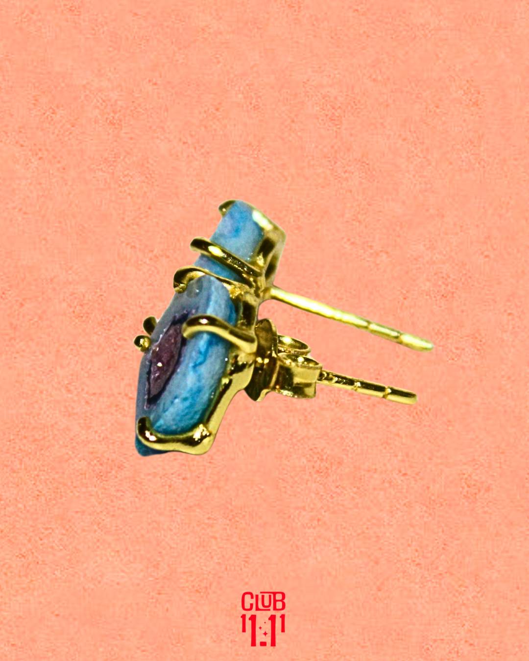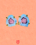 A pair of stud earrings featuring blue and pink geode stones, each with a natural sparkling effect that highlights their unique character. Set in 925 sterling silver and electroplated with 2 micron gold, they symbolize love all around you.