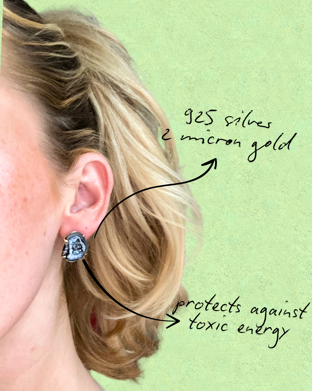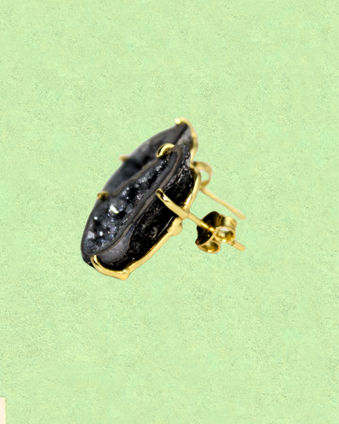 A pair of stud earrings featuring dark geode stones, each with a natural sparkling effect that highlights their unique character. Set in 925 sterling silver and electroplated with 2 micron gold, they symbolize inner strength and protection, while the dark tones are believed to encourage grounding, balance, and resilience.