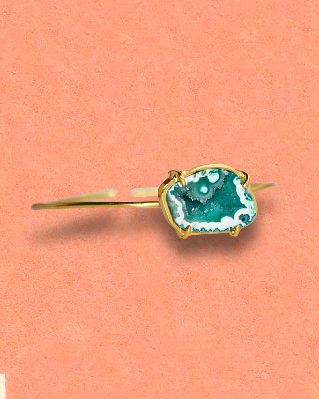 Handmade adjustable bracelet made of 925 sterling silver with a 2-micron gold plating, featuring a green geode stone. Green stones are often associated with balance, renewal, and emotional healing, symbolizing growth and harmony.